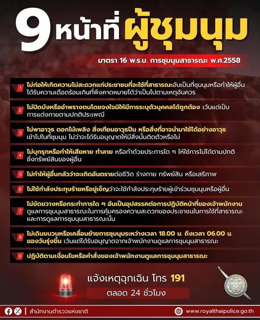 สำนักงานตำรวจแห่งชาติ ขอประชาสัมพันธ์ หน้าที่ของผู้ชุมนุมในการชุมนุมสาธารณะ พึงปฏิบัติเพื่อร่วมกันบริหารจัดการการชุมนุมสาธารณะให้เป็นไปด้วยความสงบเรียบร้อย ไม่ละเมิดสิทธิเสรีภาพของผู้อื่น
