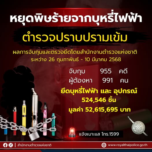 หยุดพิษร้ายจากบุหรี่ไฟฟ้า . สำนักงานตำรวจแห่งชาติปราบปรามเข้ม จับกุมตรวจยึดอย่างต่อเนื่อง กว่า 2 สัป