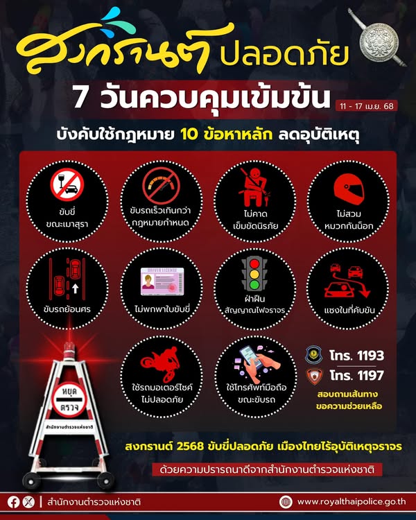 เริ่มแล้ว 7 วัน ควบคุมเข้มข้น ขับขี่ปลอดภัย เมืองไทยไร้อุบัติเหตุจราจร ตำรวจบังคับใช้กฎหมาย 10 ข้อหา