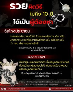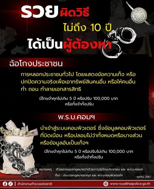 “สำนักงานตำรวจแห่งชาติ” ห่วงใย ไม่แนะนำให้รวยทางลัด รวยเร็วด้วยวิธีผิดกฎหมาย อาจเข้าข่ายฉ้อโกงประชาชน และเข้าข่ายความผิด พ.ร.บ.คอมพิวเตอร์ฯ