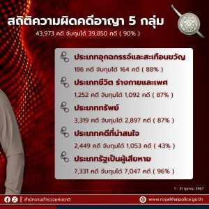 1️⃣ สถิติความผิดคดีอาญา 5 กลุ่ม ทั้งหมด 43,973 คดี จับกุมได้ 39,850 คดี ( 90% )