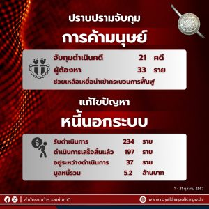 สืบสวนปราบปรามการกระทำผิดเกี่ยวกับการค้ามนุษย์ทั่วประเทศ โดยได้จับกุมดำเนินคดีแล้ว 21 คดี ผู้ต้องหา 33 ราย ส่วนเหยื่ออยู่ระหว่างการช่วยเหลือในกระบวนการฟื้นฟูต่อไป