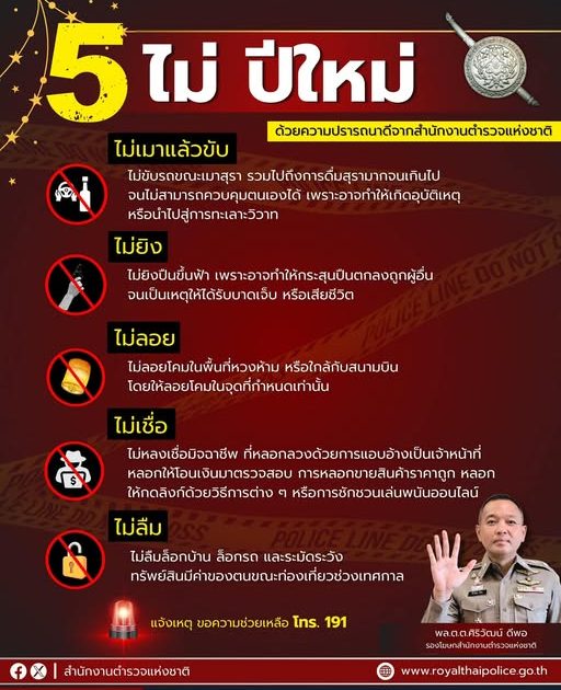 สำนักงานตำรวจแห่งชาติ จึงขอแนะนำ “5 ไม่” ปีใหม่ ส่งท้ายปีเก่า เพื่อให้พี่น้องประชาชน ระมัดระวังการกระทำที่อาจก่อให้เกิดอันตรายกับบุคคลอื่น และอาจเข้าข่ายเป็นความผิดตามกฎหมาย รวมไปถึงระวังภัยจากมิจฉาชีพที่อาจฉวยโอกาสก่อเหตุในช่วงเทศกาล ดังนี้